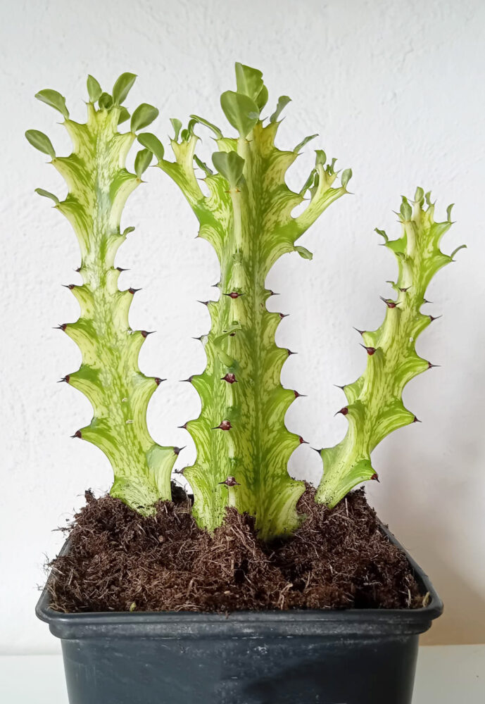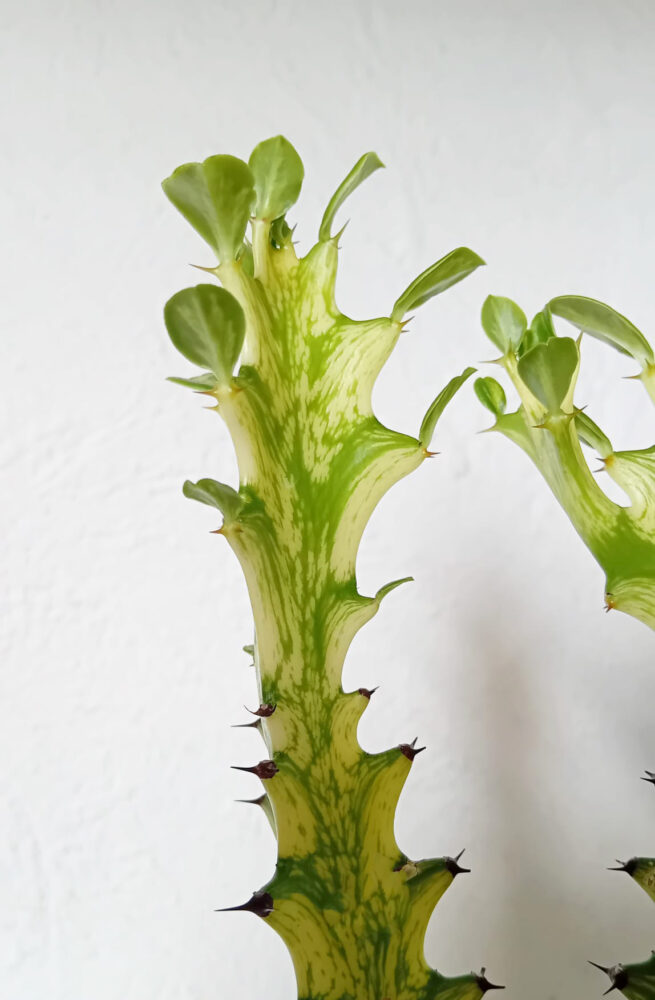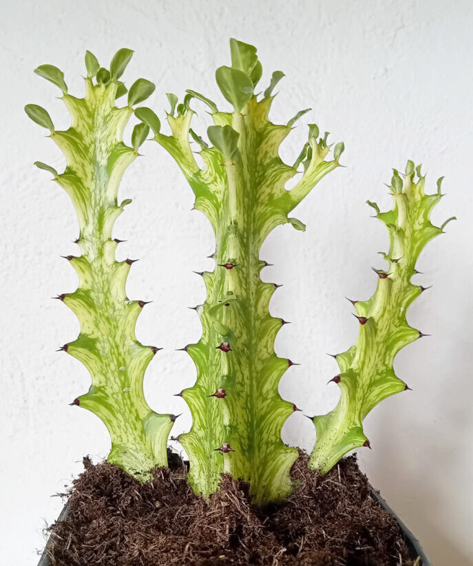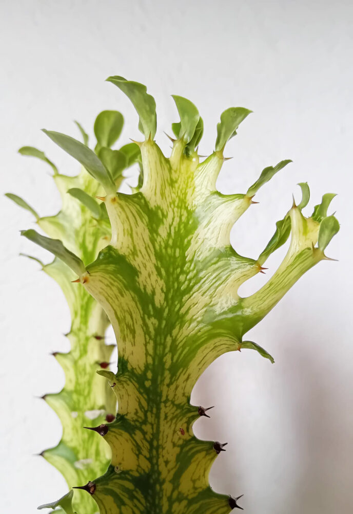 La Euphorbia trigona cv. ‘Mint cream’ es una variedad de Euphorbia trigona que destaca por los contrastes entre verde y color crema que crean unos patrones fascinantes. Aunque es de fácil cuidado, es necesario recalcar que tenemos que ser precavidos con el sol que reciben, ya que el sol directo podría quemar sus partes mas claras.